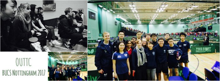 Having departed Oxford at varying times, all the members of OUTTC arrived safe and well at Nottingham for a fierce BUCS Individuals showdown! With record numbers of 16 players, we were ready to put our new training scheme in to practice and show the country that we’re a force to be reckoned with. Throughout the weekend our team spirit was strong. Every match was allocated a coach and those who weren’t playing were conscientious in their support. For sure we were the loudest club there even without Sonia’s penetrating ‘Tsa!’s . By the end of an exhausting first day all the ladies made it through to either the last 64 or the plate competition, with the men following suit, requiring matches from everyone again on the second day. Back to the hotel for pizza!